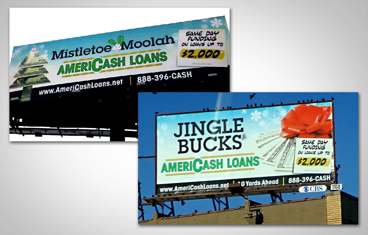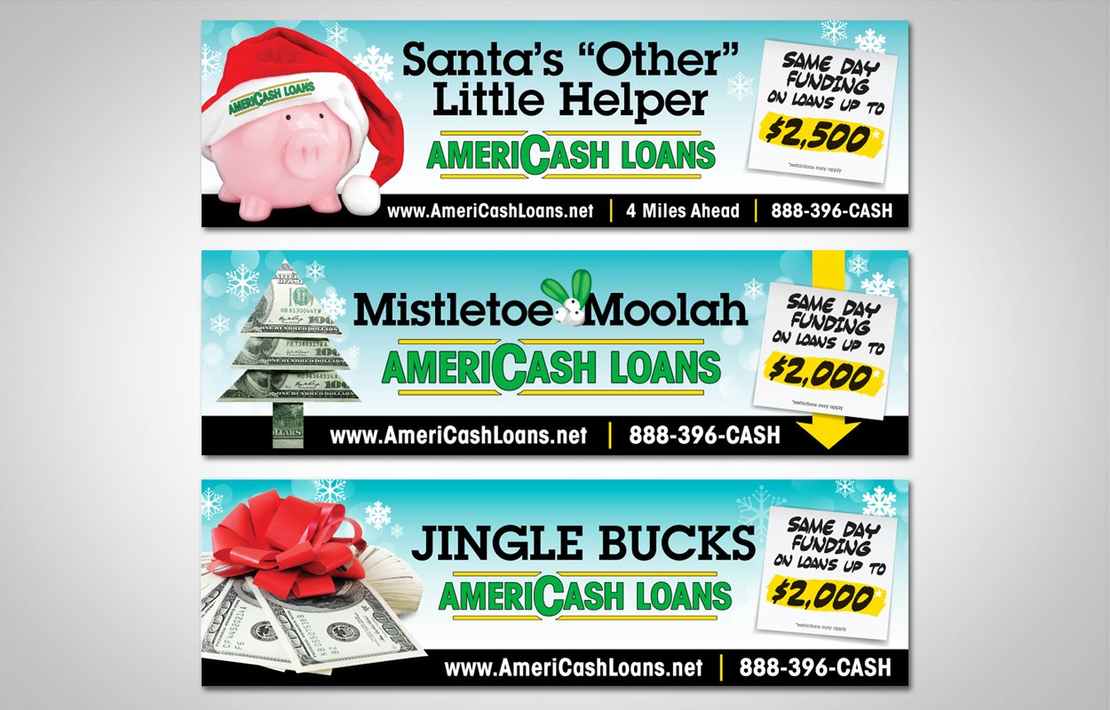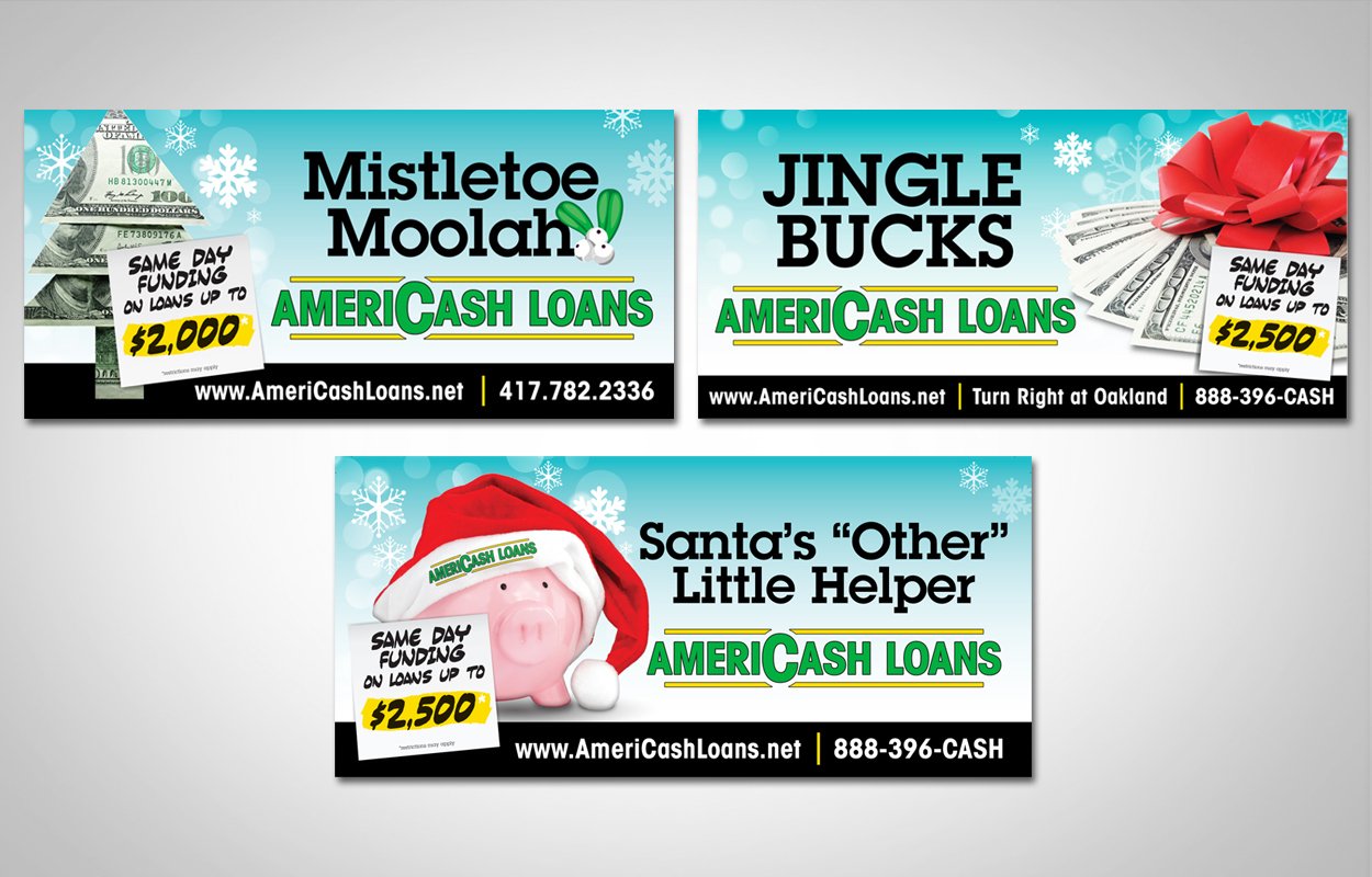 Holiday billboards for Americash Loans that were displayed throughout the Chicagoland area. Three general designs that were resized and slightly altered for various locations.