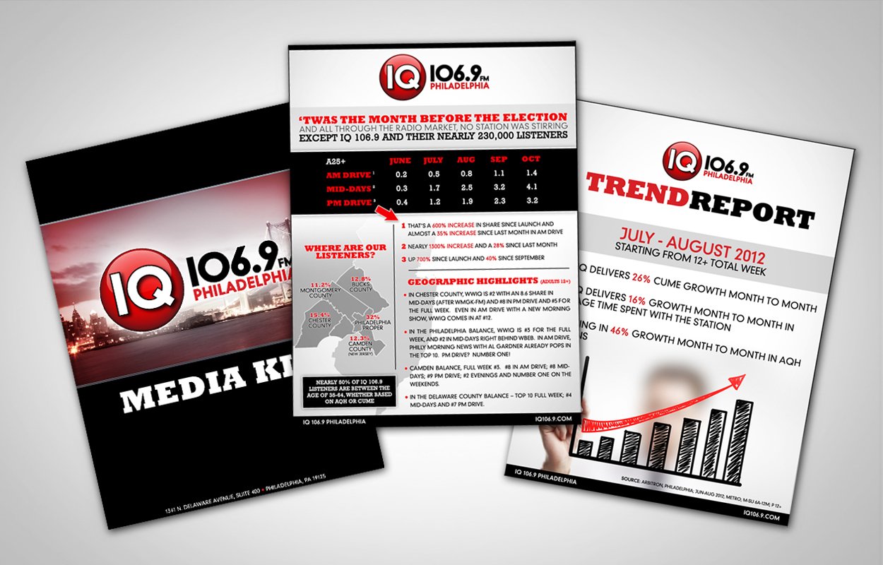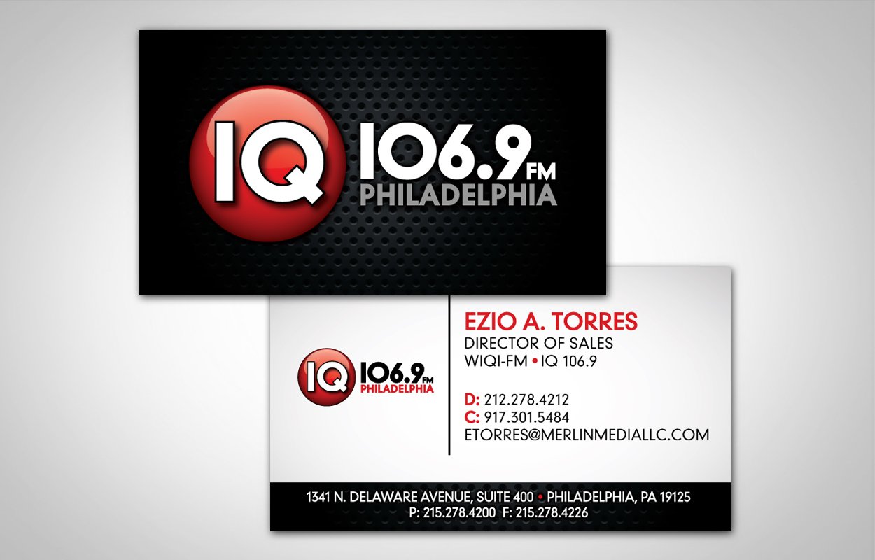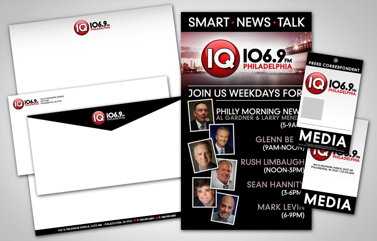 Visual identity for the Philadelphia radio station, IQ 106.9FM. Created the identity, which included logo, sales materials, business cards, ads, press passes and stationary.