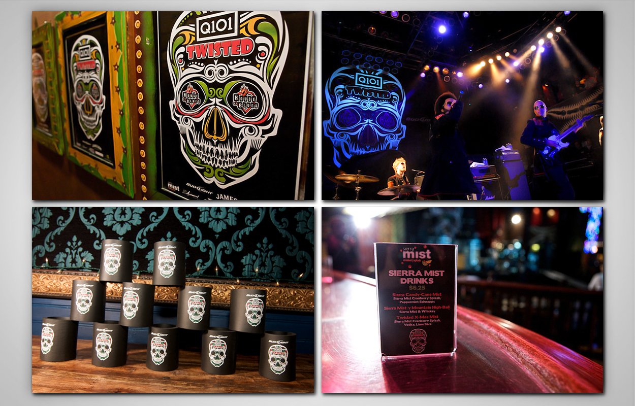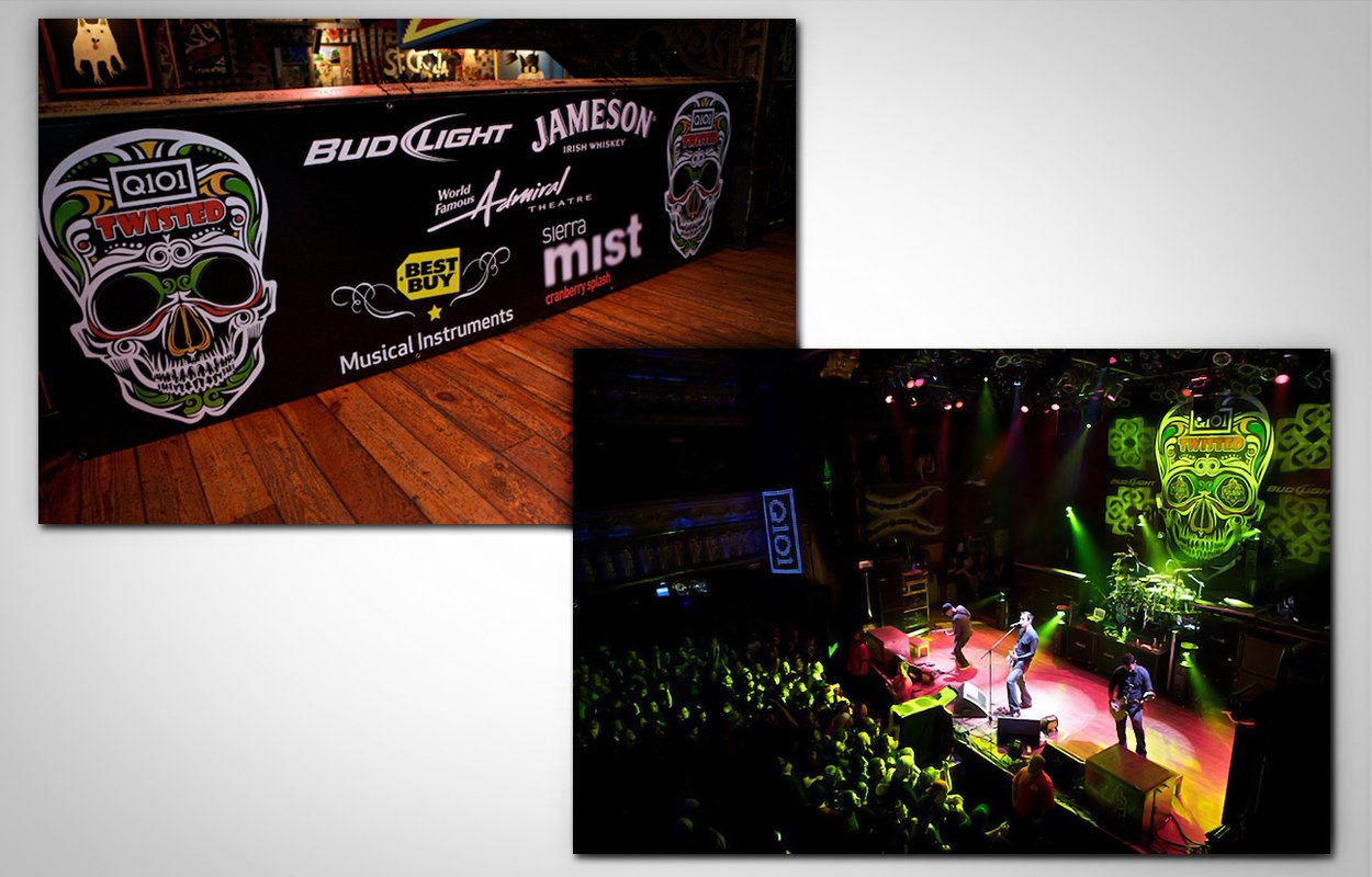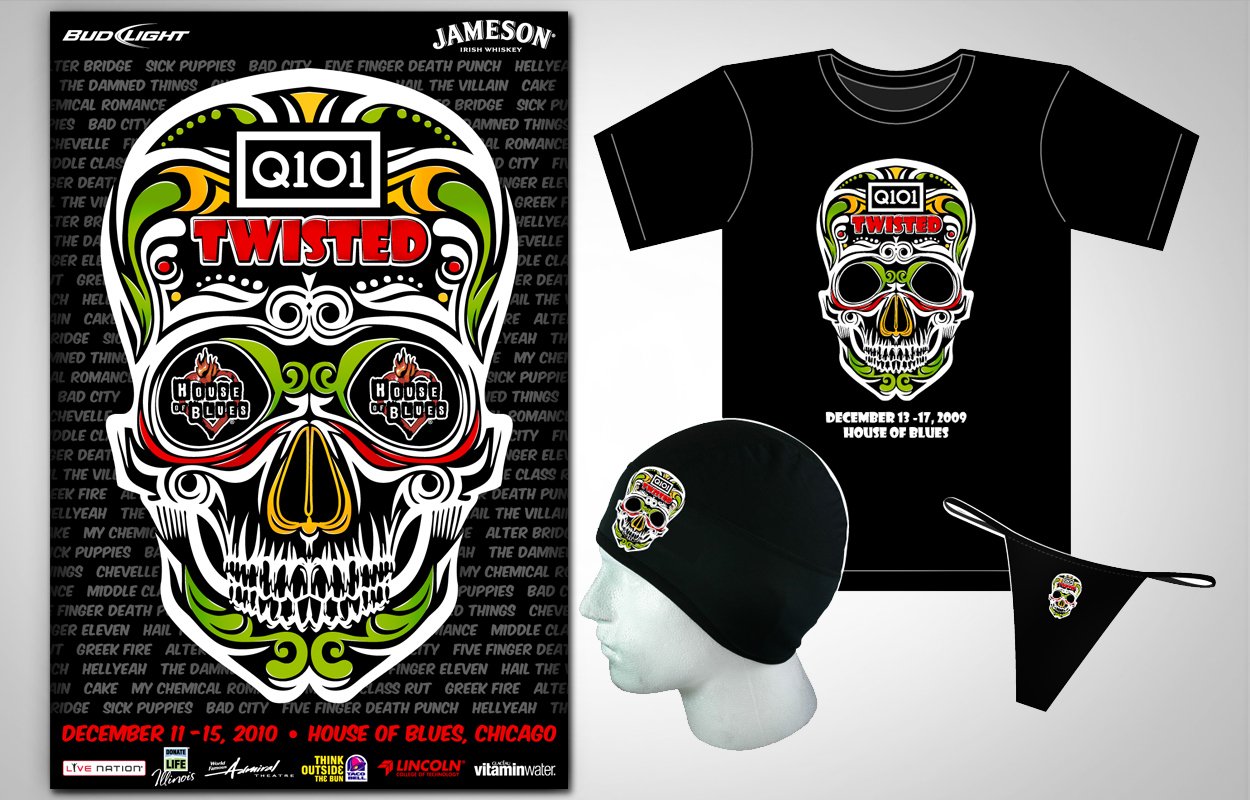 Concert design for the Chicago radio station Q101. Both Twisted 16 (2009) and 17 (2010) had the same design. Pieces included: poster, ads, main stage backdrop, various signage throughout venue, bar menu cards, apparel and koozies.