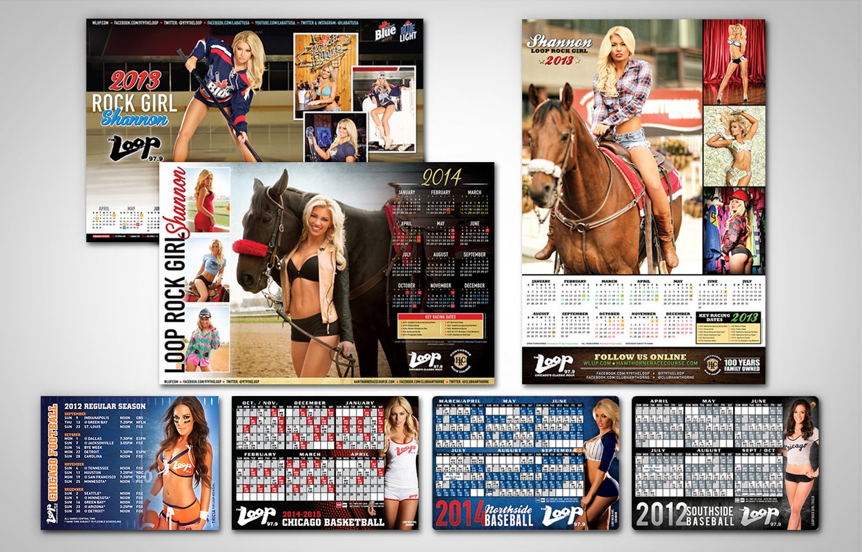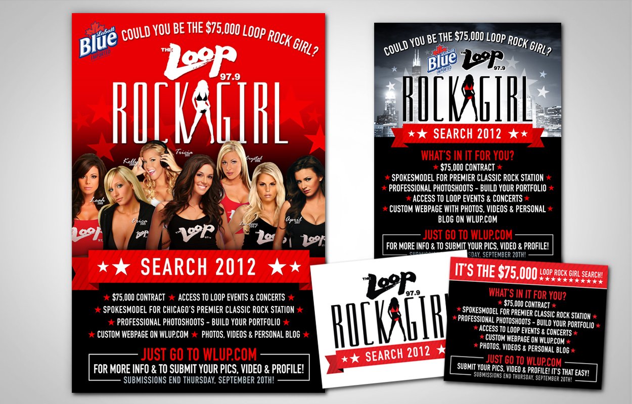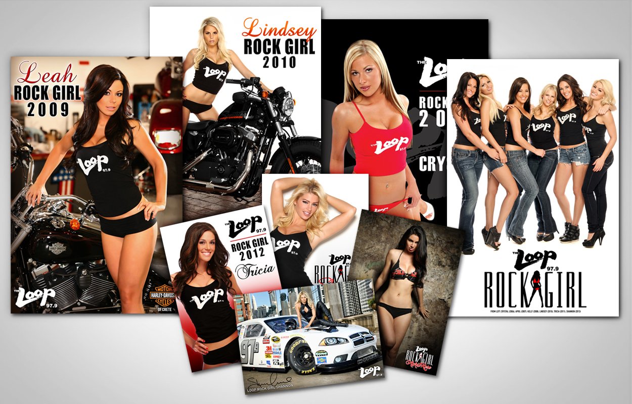 Identity for 97.9 The Loop’s spokesmodel. Design work includes: logo, posters, calendars, sports schedule magnets, posters/flyers/cards for the Rock Girl Search and more!