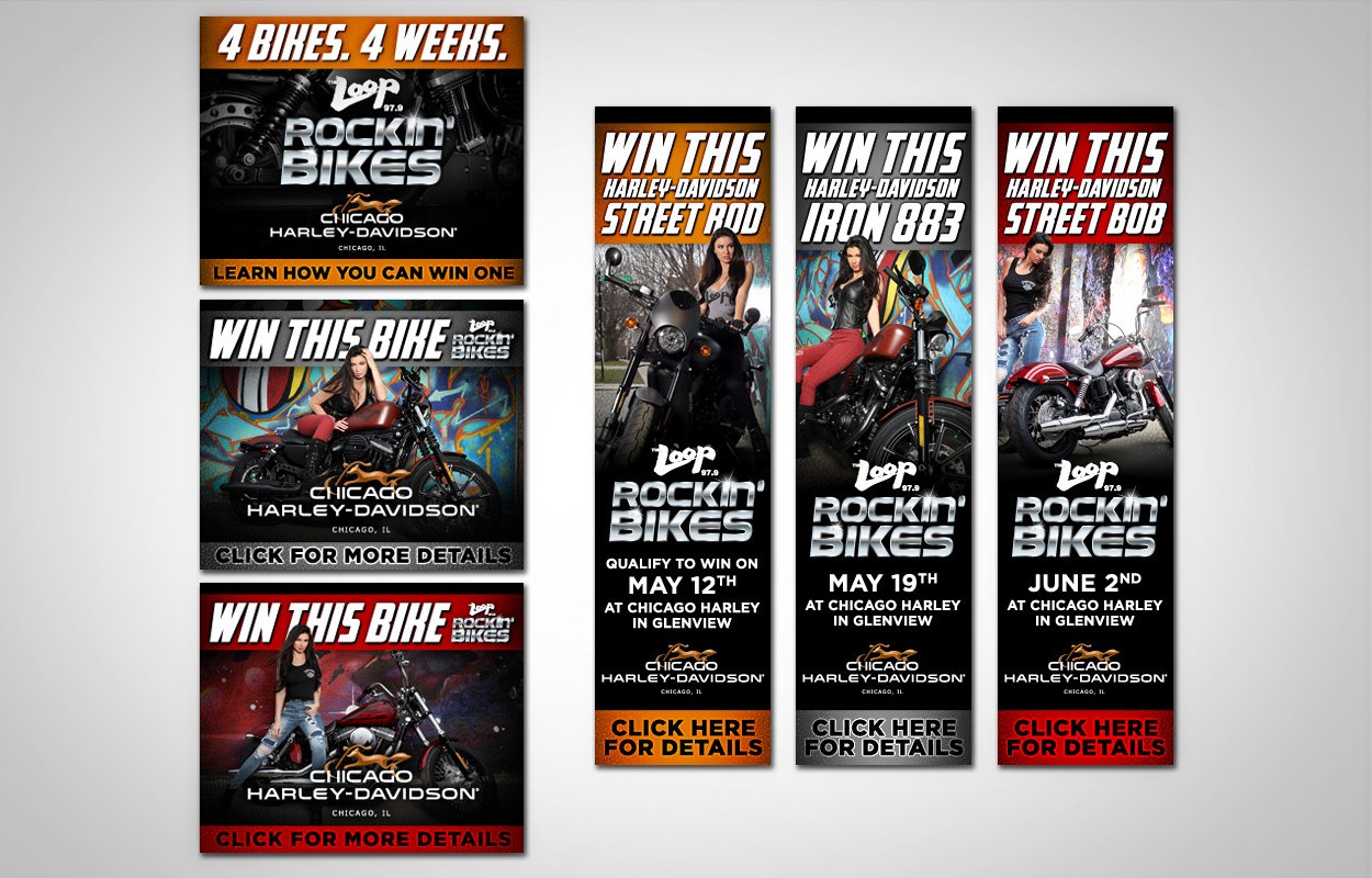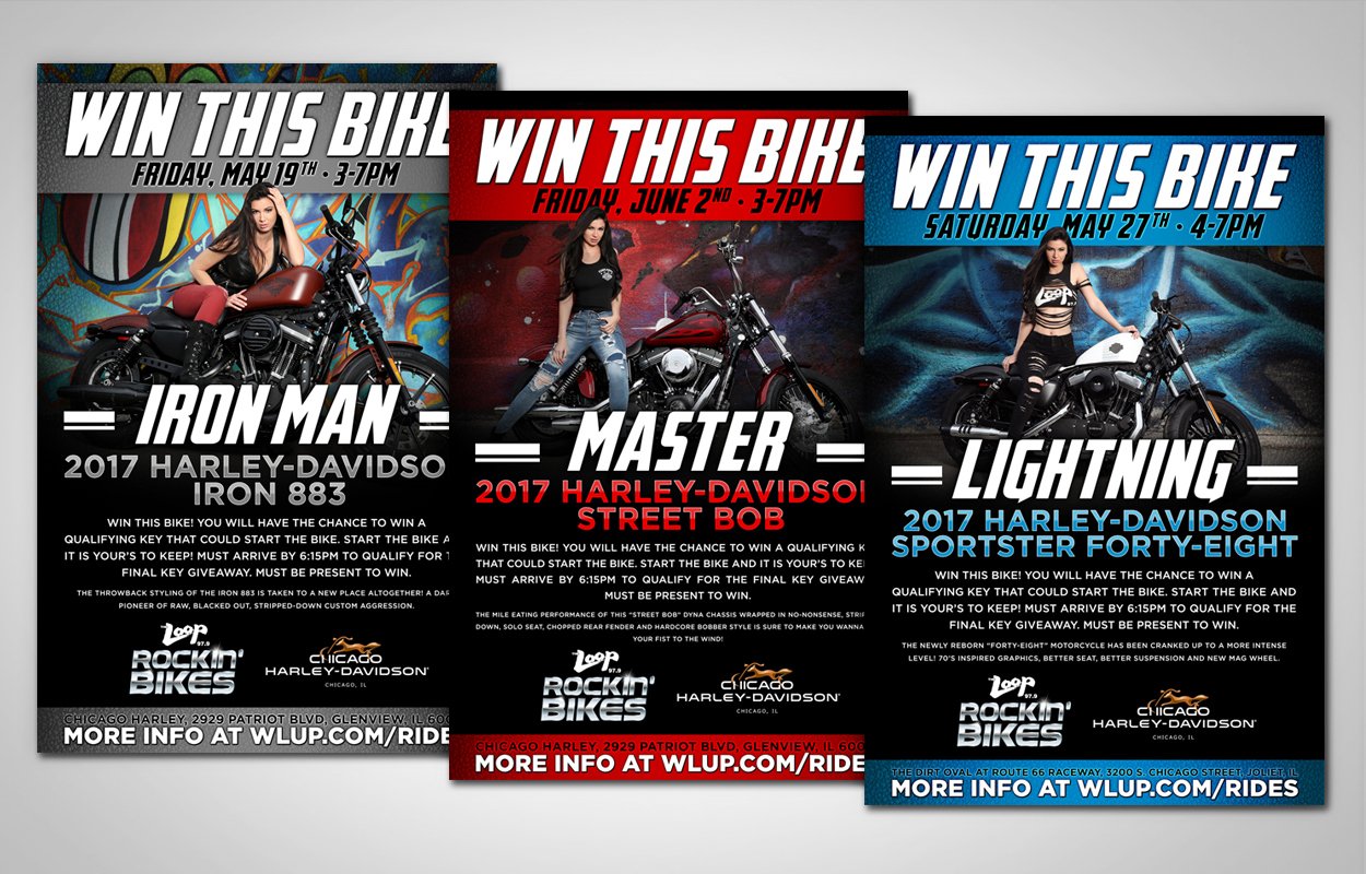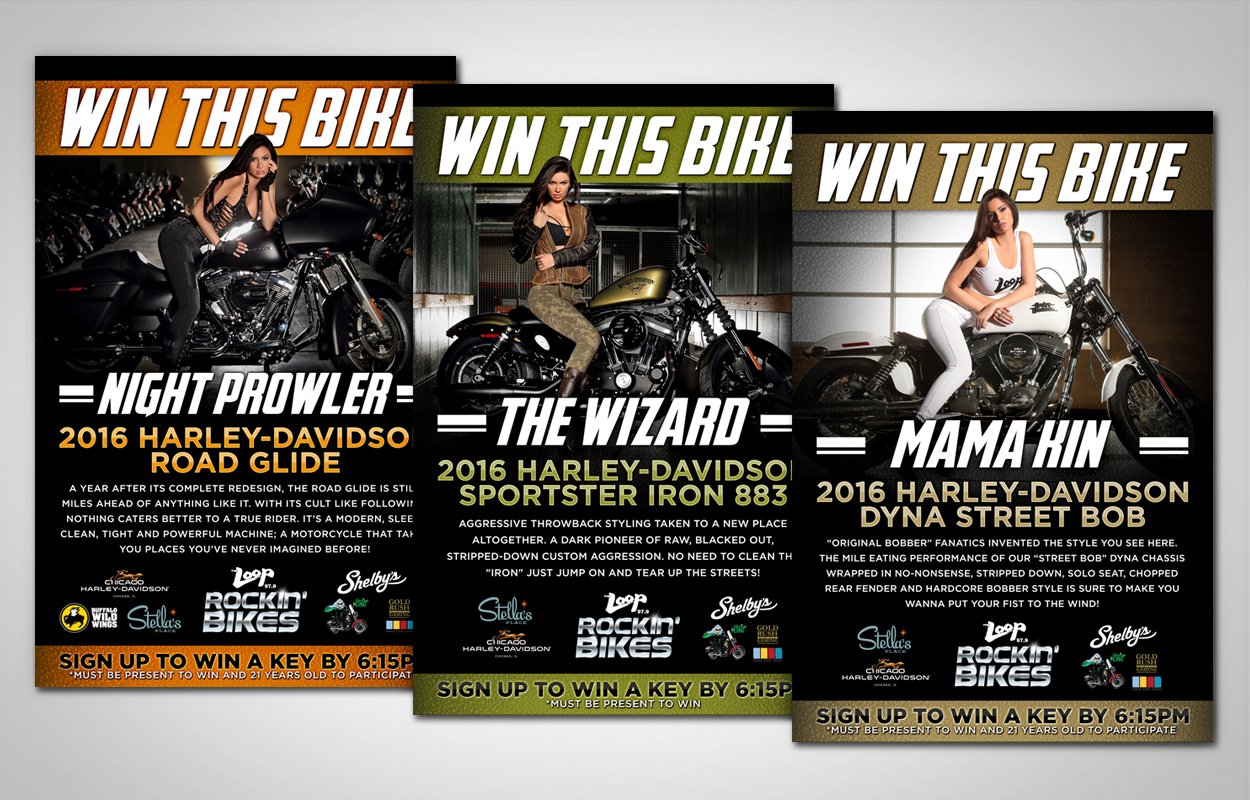 The Loop’s Rockin’ Bikes was a promotion between 97.9 The Loop, a heritage Chicago radio station, and Chicago Harley-Davidson, branded with The Loop Rock Girl. Listeners had a chance to win one of four HD motorcycles. The promotion ran two different times. It started with the logo and posters, which were then resized for web banners, flyers and various in-store pieces. Project similar the The Loop’s Rockin’ Rides.